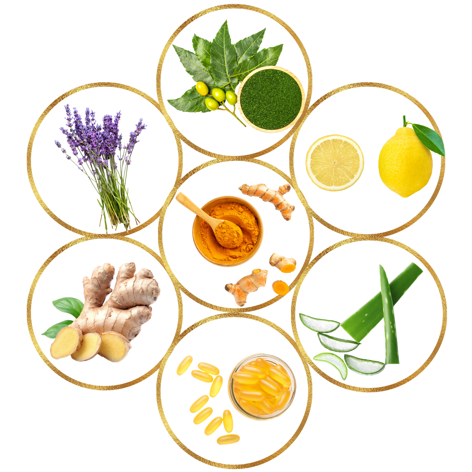 neem, turmeric, lemon, lavender, ginger, aloe vera, and apple cider vinegar.