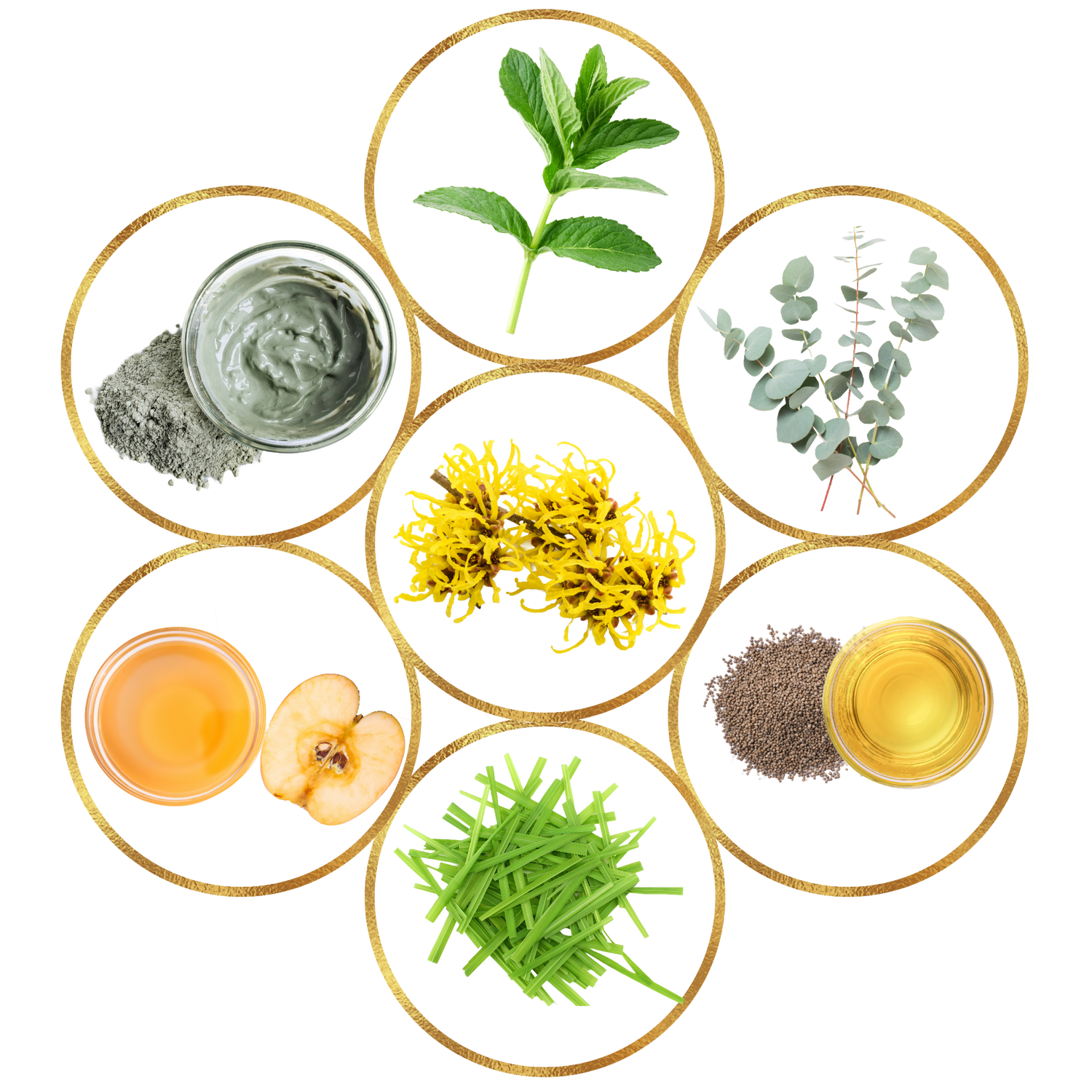 frankincense, witch hazel, green tea extract, black seed, tea tree, lavender, lemongrass, clay, apple cider vinegar, mint, and Argan oil.